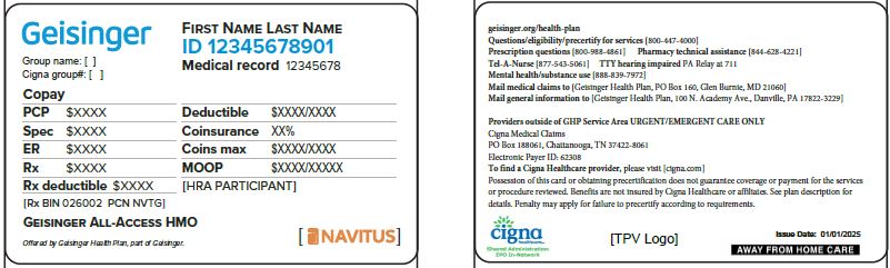 ID cards above are not inclusive of all Geisinger Health Plan ID card types. Geisinger Health Plan ID cards will include the Cigna Healthcare logo and claim submission information, when applicable. Self-funded plan sponsor ID cards may contain the plan sponsor logo.